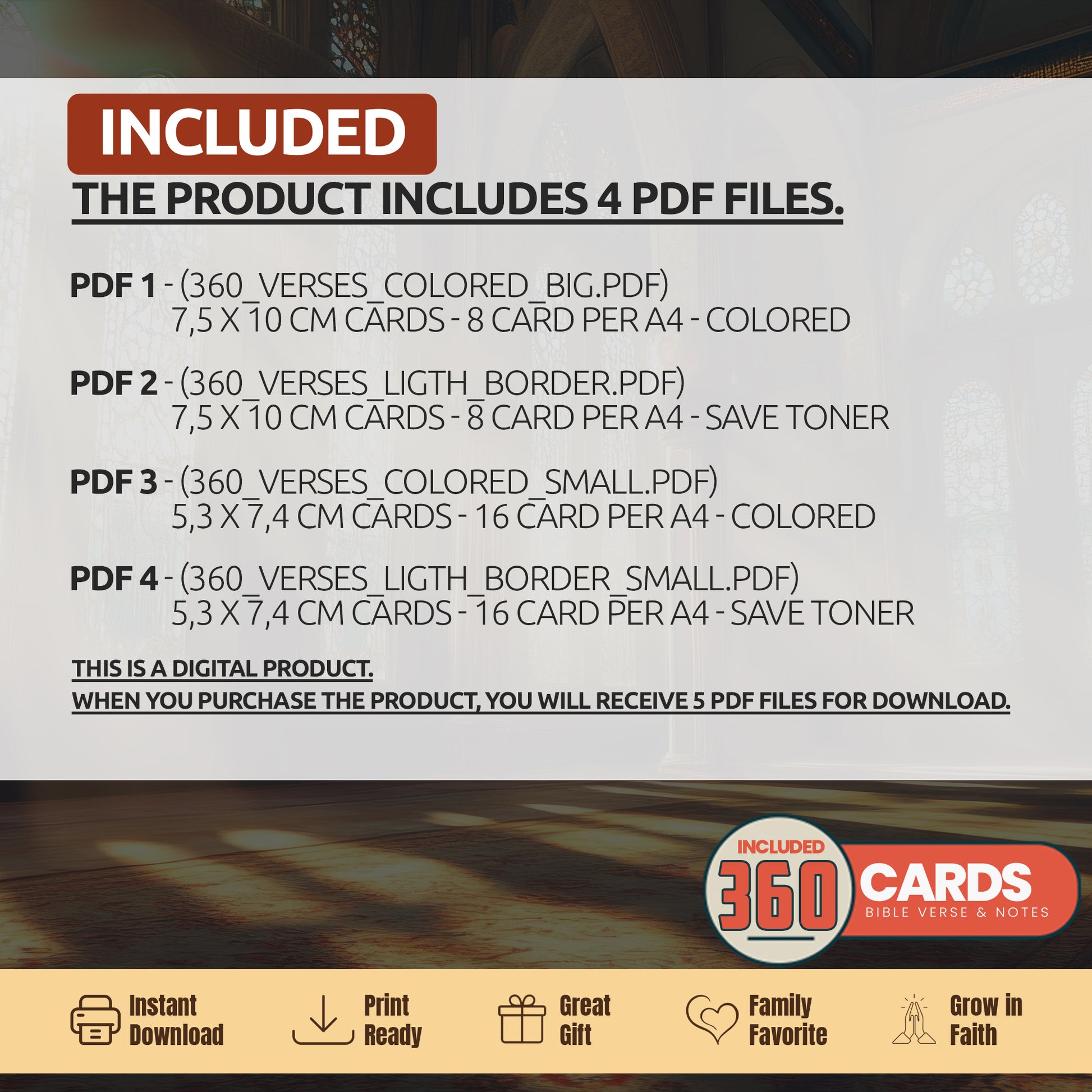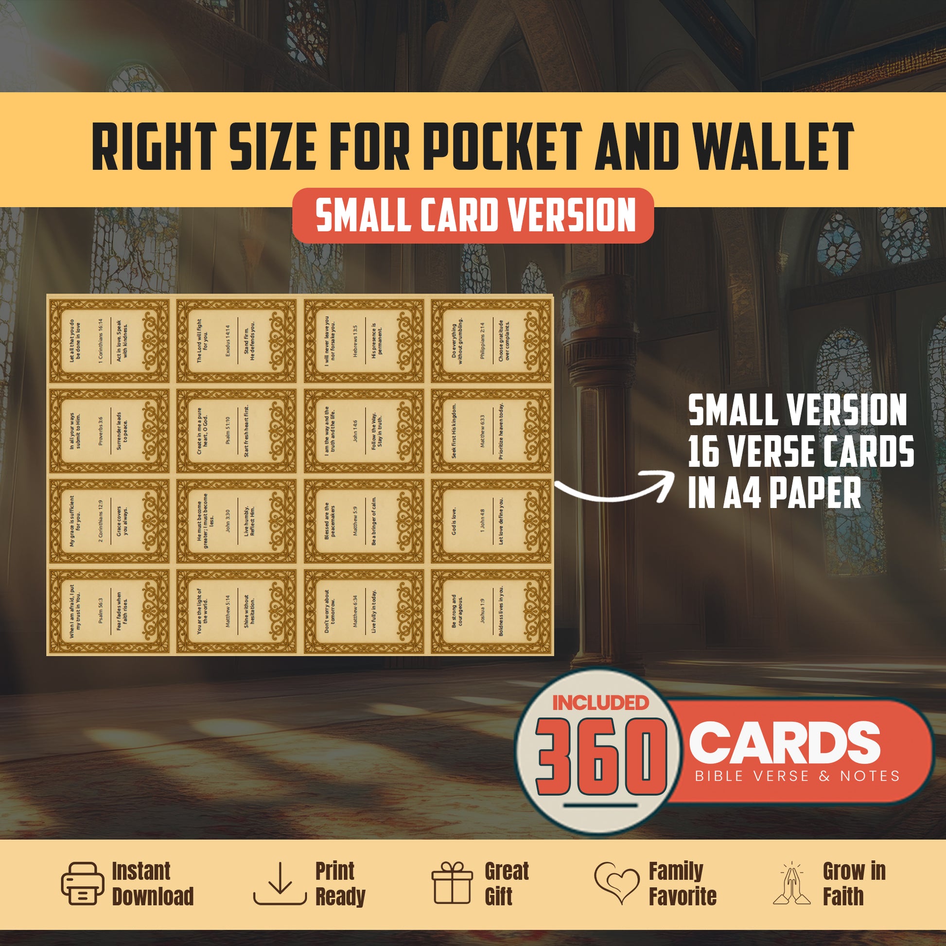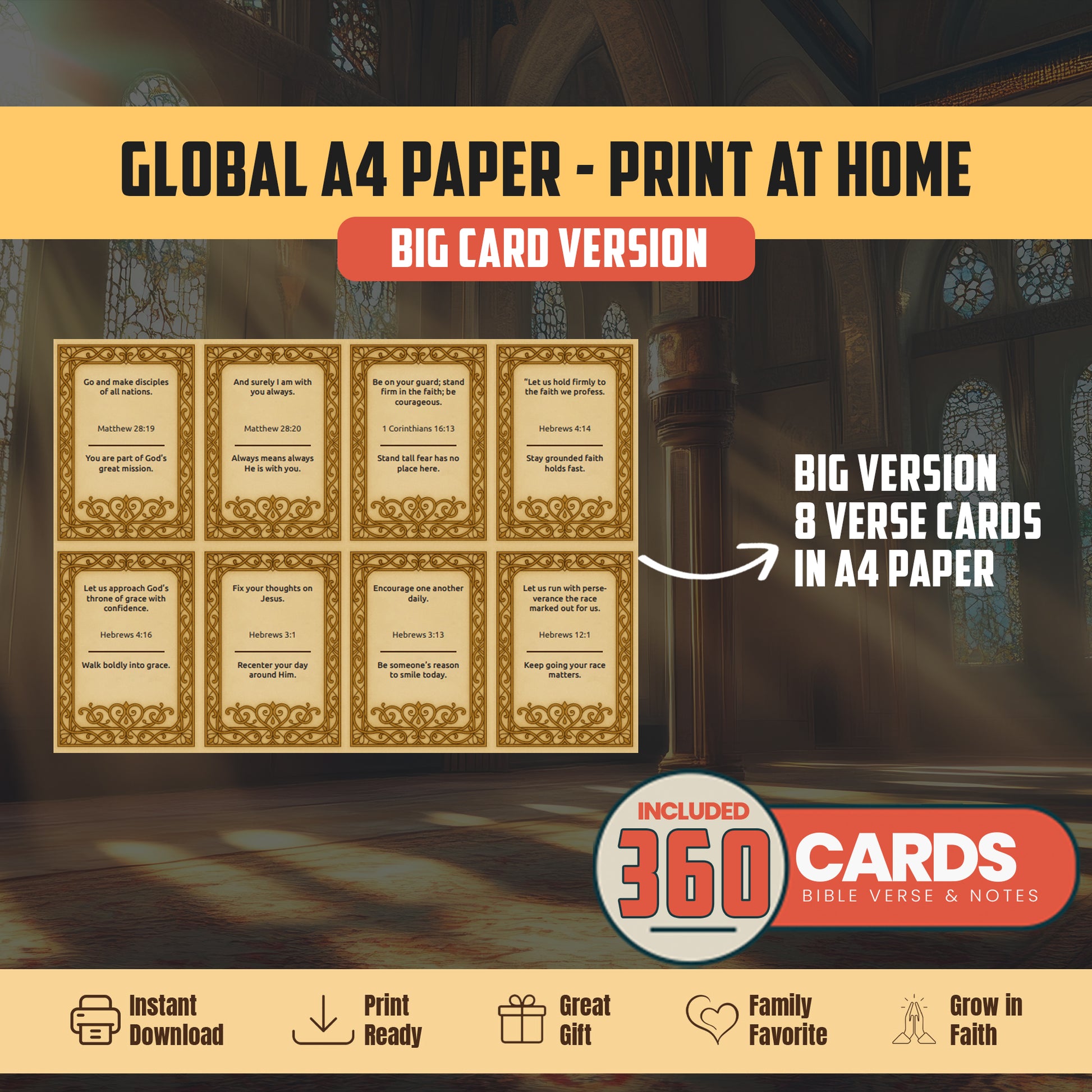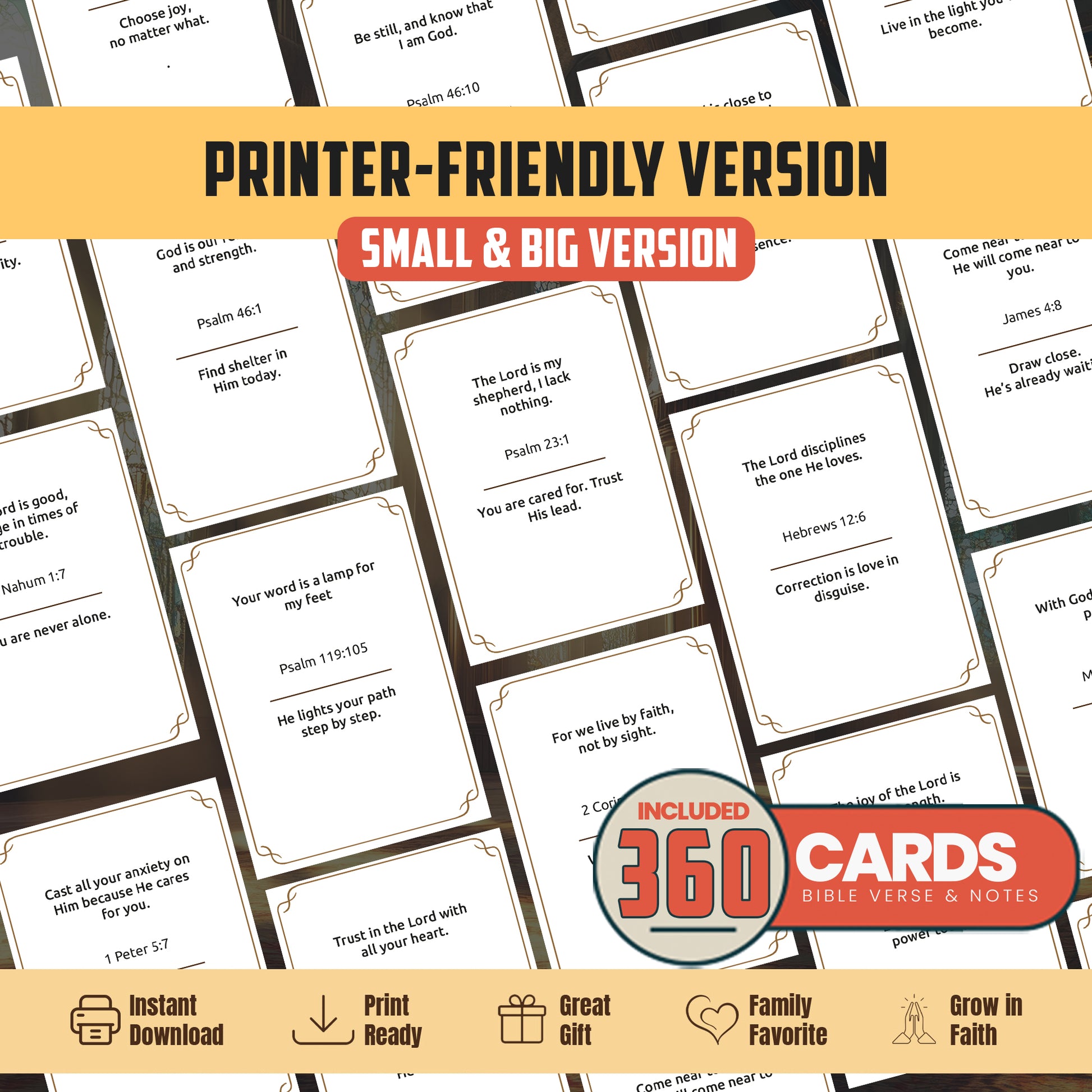 Bring faith and encouragement into your daily life with this 360 Printable Bible Verse Cards with Daily Life Notes set. Perfect for personal use, Bible study groups, Sunday school, or as a thoughtful Christian gift.